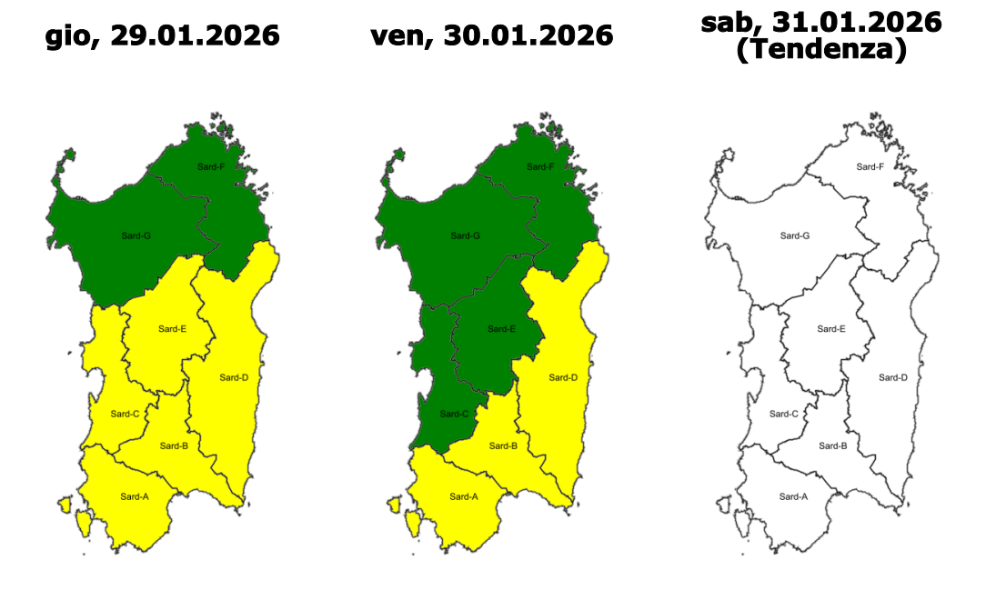 - codice GIALLO (criticità ORDINARIA) per RISCHIO IDRAULICO sulle aree di allerta Iglesiente, Campidano, Montevecchio Pischinappiu (che comprende anche Oristano), Flumendosa Flumineddu, e Tirso