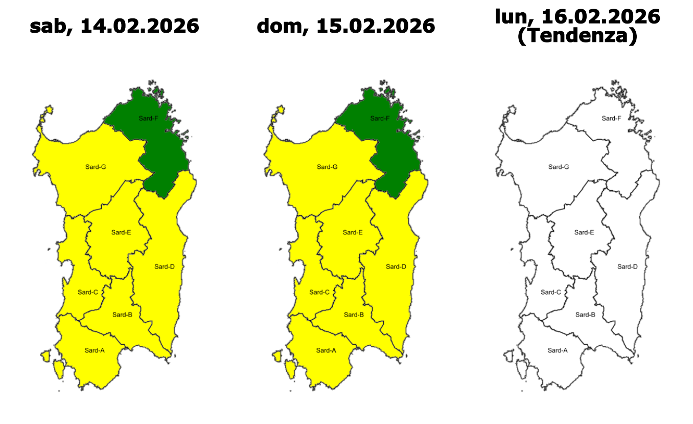- codice GIALLO (criticità ORDINARIA) per RISCHIO IDRAULICO e RISCHIO IDROGEOLOGICO sulle aree di allerta Iglesiente, Campidano, Montevecchio Pischinappiu (che comprende anche Oristano), Flumendosa Flumineddu, Tirso, e Logudoro