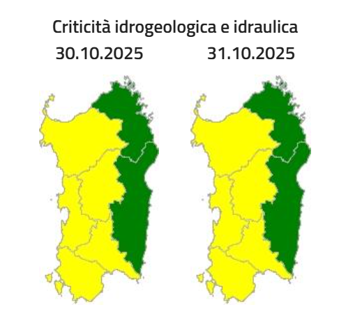 - codice GIALLO (criticità ORDINARIA) per rischio idrogeologico e idrogeologico per temporali sulle aree di allerta Iglesiente, Campidano, Montevecchio Pischinappiu (che comprende anche Oristano), Tirso e Logudoro;