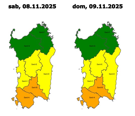 - codice ARANCIO (criticità MODERATA) per RISCHIO IDROGEOLOGICO, codice GIALLO (criticità ORDINARIA) per RISCHIO IDROGEOLOGICO PER TEMPORALI sulle aree di allerta Iglesiente e Campidano;