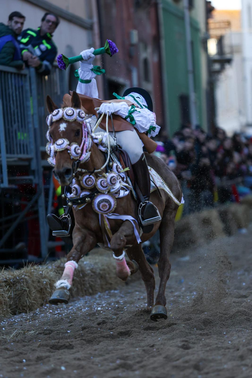 Prima della Corsa delle Pariglie, spazio all’ormai tradizionale festa dei coriandoli, che ha imbiancato il percorso e le tribune di via Duomo: un momento attesissimo per dare libero sfogo alla voglia di festa.