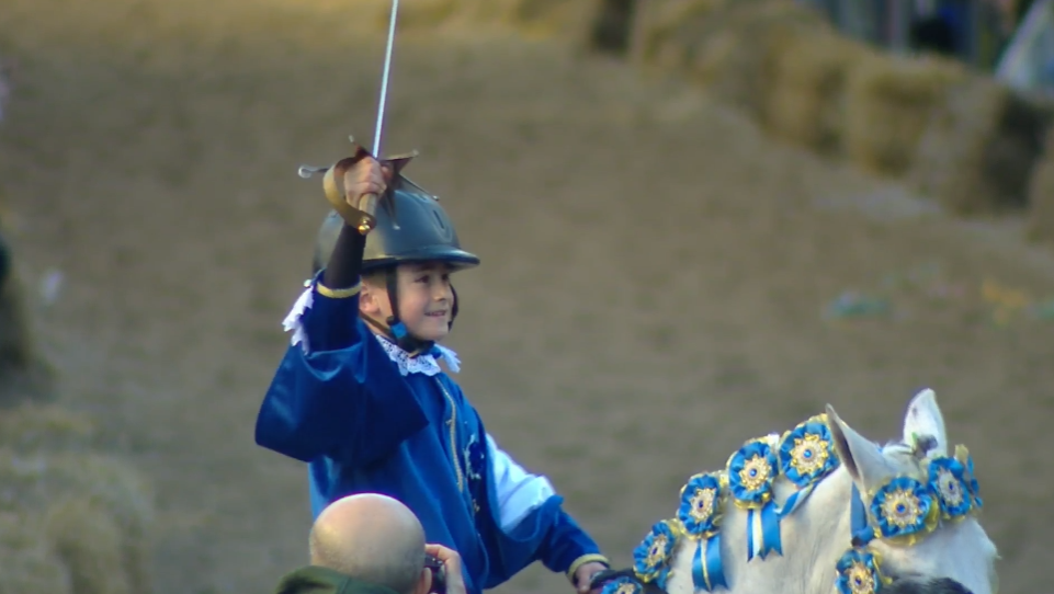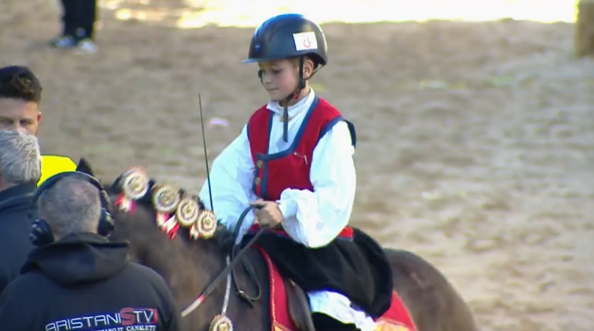 La giornata di Gabriele Piras, 17 anni, di Oristano, si è aperta con la vestizione in piazza Roma, sotto la torre di San Cristoforo. Indossati i panni di Su Componidoreddu, in sella a Pioggia, ha guidato il corteo dei 38 mini cavalieri, tornati finalmente numerosi, fino a via Duomo. Dopo il rito del triplice incrocio delle spade, con Su Segundu Francesco Tumbarello, il capocorsa ha centrato la stella al primo tentativo. Una gioia incontenibile ha accompagnato la sua discesa, veloce e composta, salutandone l’esito positivo.