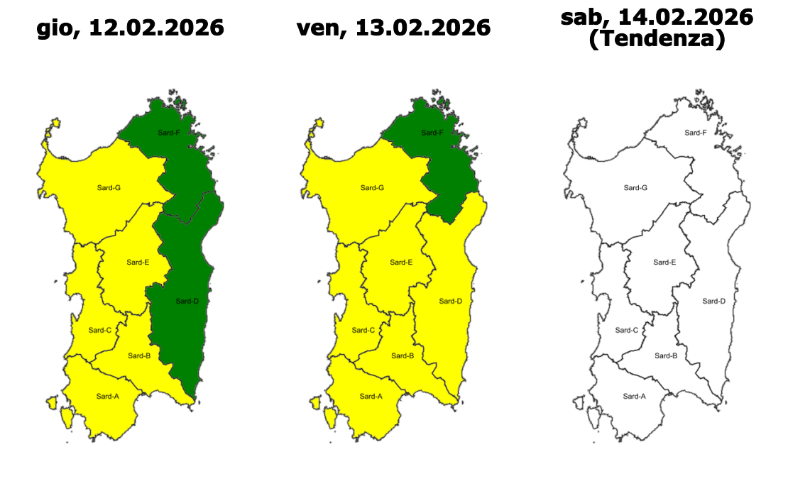 - codice GIALLO (criticità ORDINARIA) per RISCHIO IDRAULICO e RISCHIO IDROGEOLOGICO sulle aree di allerta Iglesiente, Campidano, Montevecchio Pischinappiu (che comprende anche Oristano), Tirso, e Logudoro