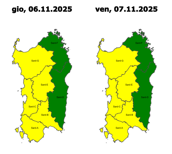 - codice GIALLO (criticità ORDINARIA) per RISCHIO IDROGEOLOGICO sulle aree di allerta Iglesiente, Campidano, Montevecchio Pischinappiu (che comprende anche Oristano), Tirso e Logudoro;