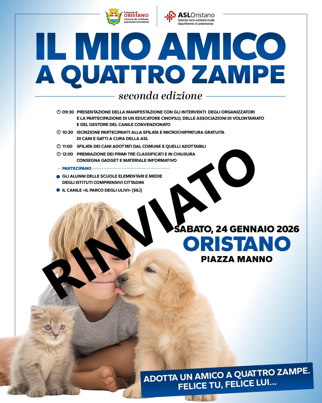 La giornata comunale del cane, programmata dal Comune e dalla ASL 5 per sabato 24 gennaio per la promozione delle adozioni e contro il randagismo, è rinviata a data da destinarsi.