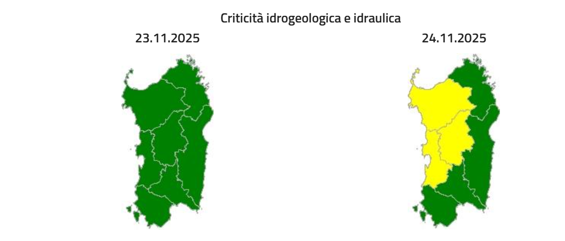 - codice GIALLO (criticità ORDINARIA) per RISCHIO IDROGEOLOGICO sulle aree di allerta Montevecchio Pischinappiu (che comprende anche Oristano), Tirso e Logudoro;