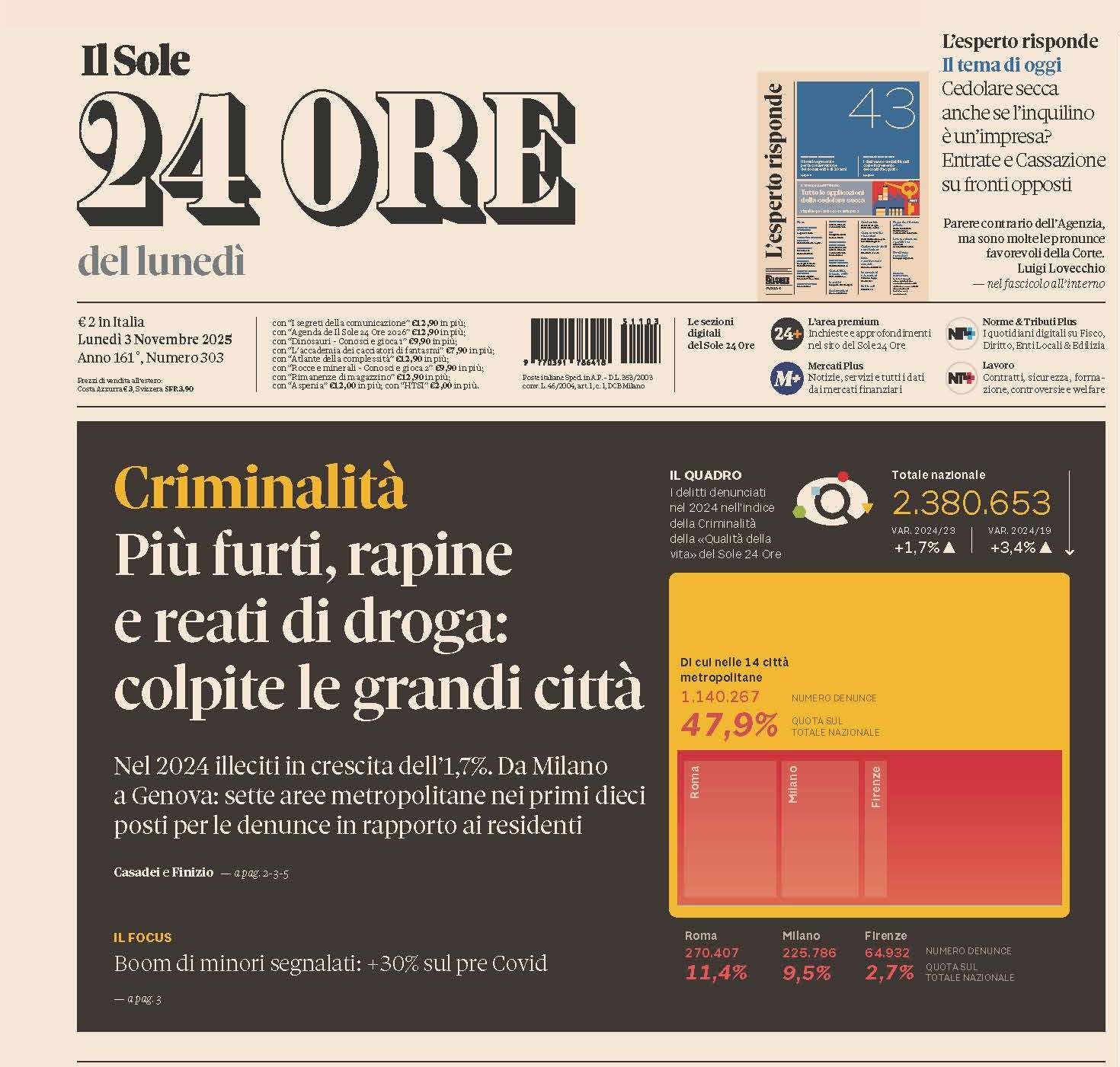 A livello nazionale, Milano, Firenze e Roma risultano le province con l’indice di criminalità più alto, mentre Oristano conferma il proprio primato di tranquillità, registrando un’incidenza di reati più di cinque volte inferiore rispetto alle grandi aree metropolitane.