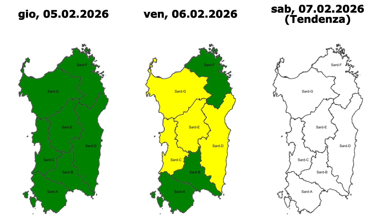 - codice GIALLO (criticità ORDINARIA) per RISCHIO IDRAULICO sulle aree di allerta Montevecchio Pischinappiu (che comprende anche Oristano), Flumendosa Flumineddu, Tirso, e Logudoro.