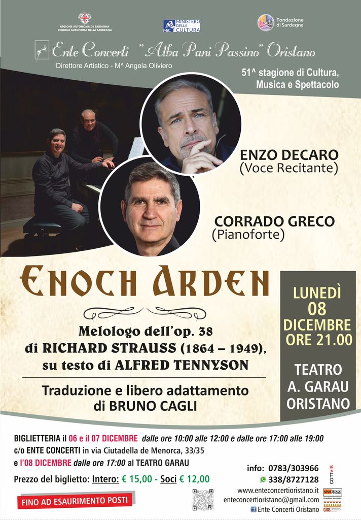 Lunedì 8 Dicembre, alle 21.00, al Teatro Garau, l’Ente Concerti “Alba Pani Passino” presenta Enoch Arden l’appuntamento speciale che vedrà protagonisti sul palco l’attore napoletano Enzo Decaro e il pianista Corrado Greco.