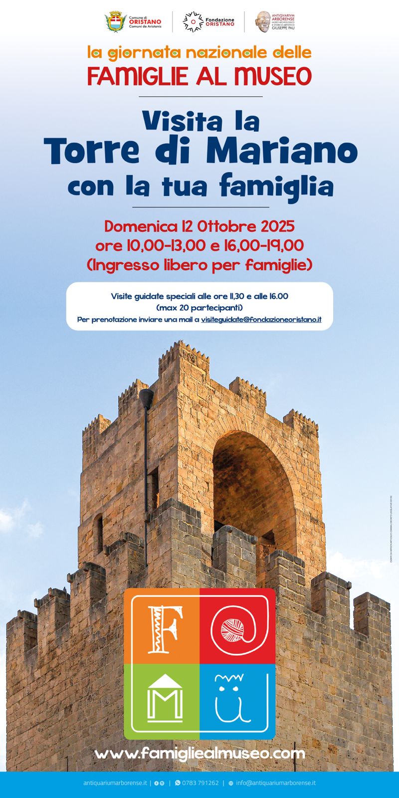 Oristano aderisce alla Giornata Nazionale delle Famiglie al Museo (F@Mu), in programma domenica 12 ottobre, con un’iniziativa speciale alla Torre di Mariano II, monumento simbolo della città e bene architettonico di rilevanza nazionale. La giornata, dedicata alla cultura vissuta in famiglia, propone un’esperienza condivisa di scoperta e conoscenza, pensata per valorizzare il patrimonio storico locale attraverso il coinvolgimento attivo di bambine, bambini e dei loro accompagnatori.