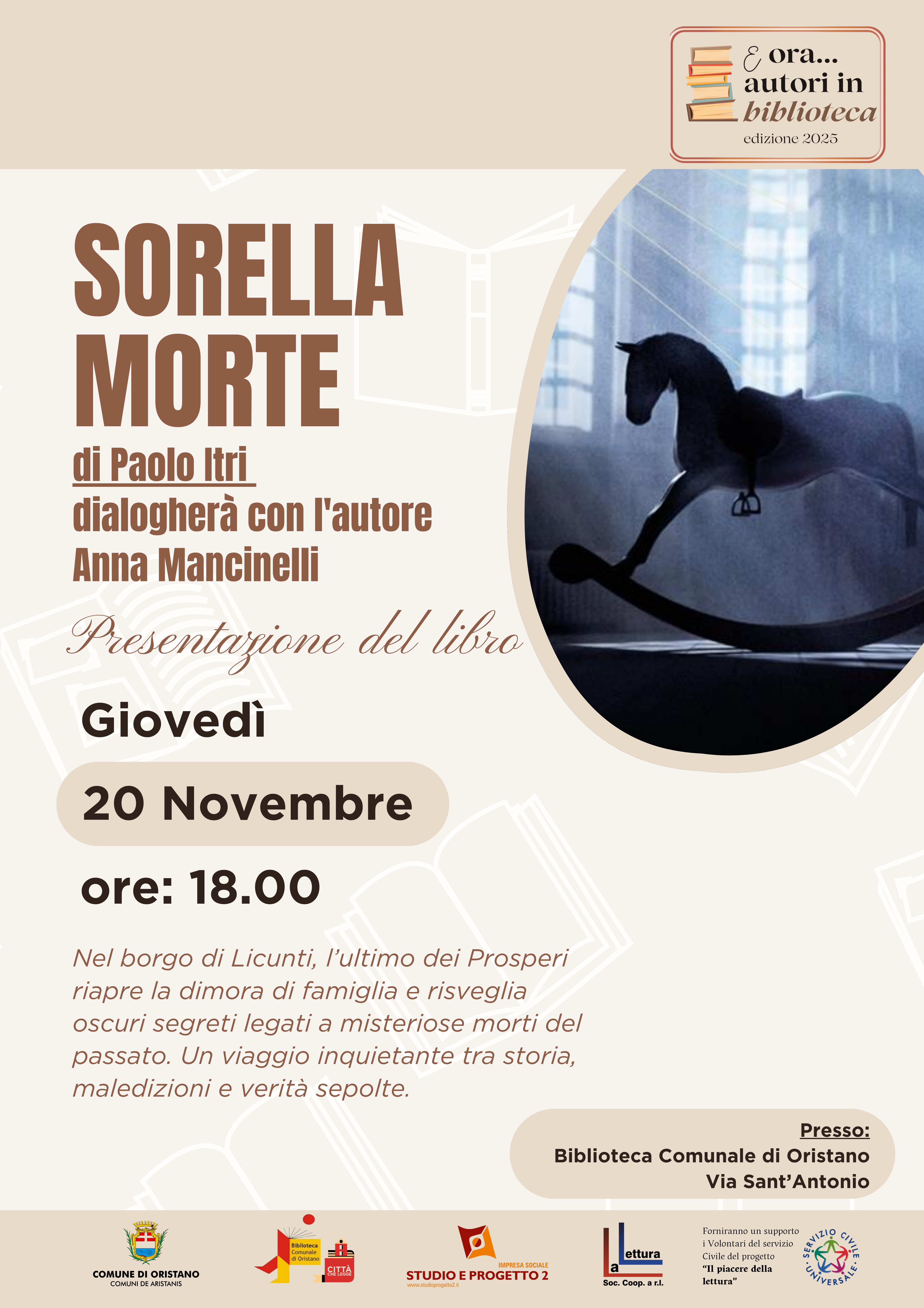 Lo scrittore Paolo Itri, che dialogherà con Anna Mancinelli, presenterà il suo ultimo romanzo “Sorella morte” edito da Mondadori.