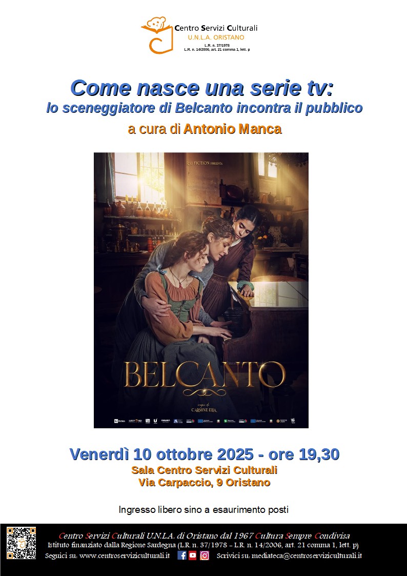 Il Centro Servizi Culturali UNLA di Oristano, venerdì 10 ottobre 2025, alle ore 19:30, propone la conferenza dal titolo “Come nasce una serie tv: lo sceneggiatore di Belcanto incontra il pubblico” a cura di Antonio Manca.