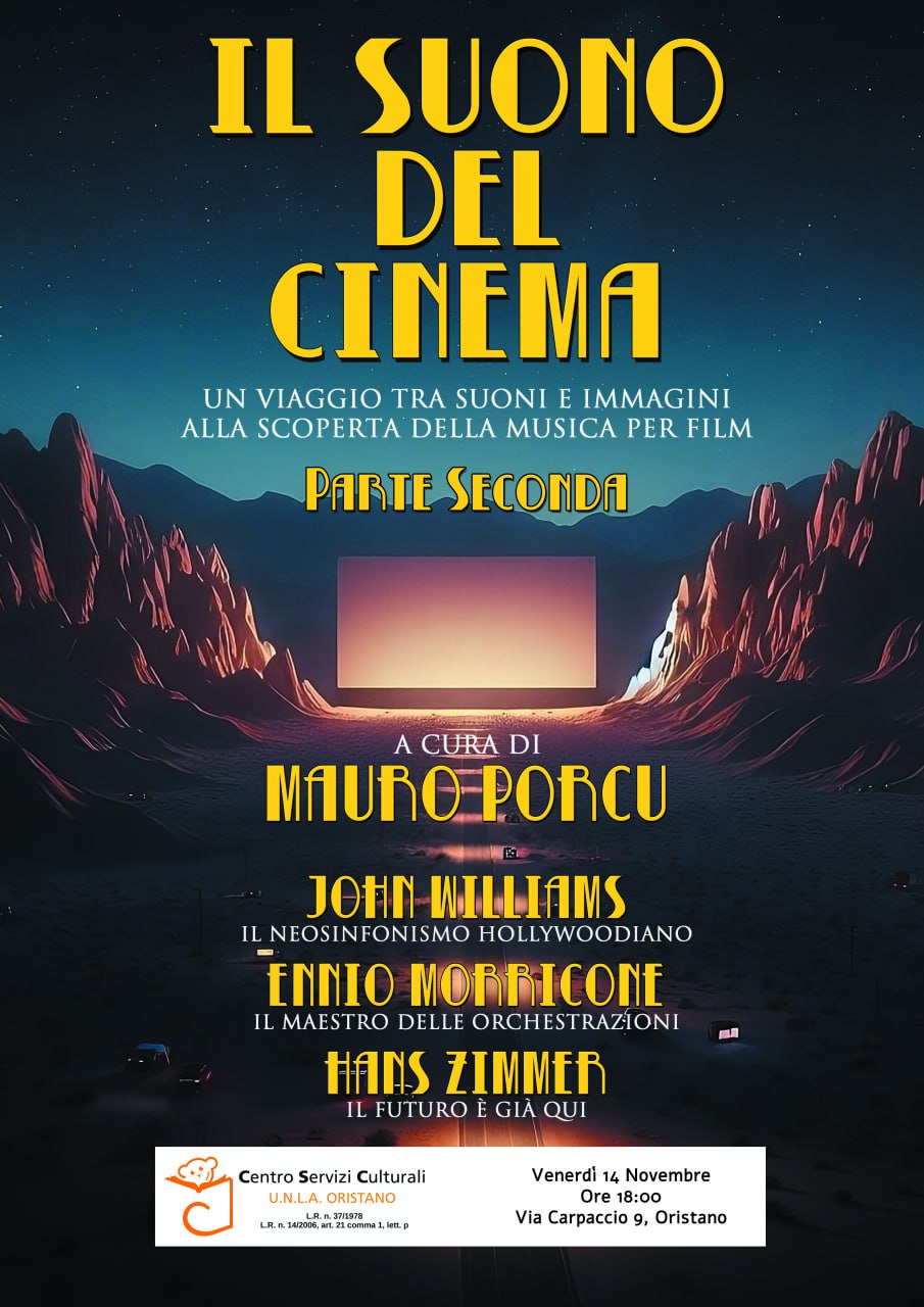 Venerdì 14 novembre 2025, alle ore 18, al Centro Servizi Culturali UNLA, la seconda parte del seminario “Il suono del cinema. Un viaggio tra suoni e immagini alla scoperta della musica per film” a cura di Mauro Porcu.