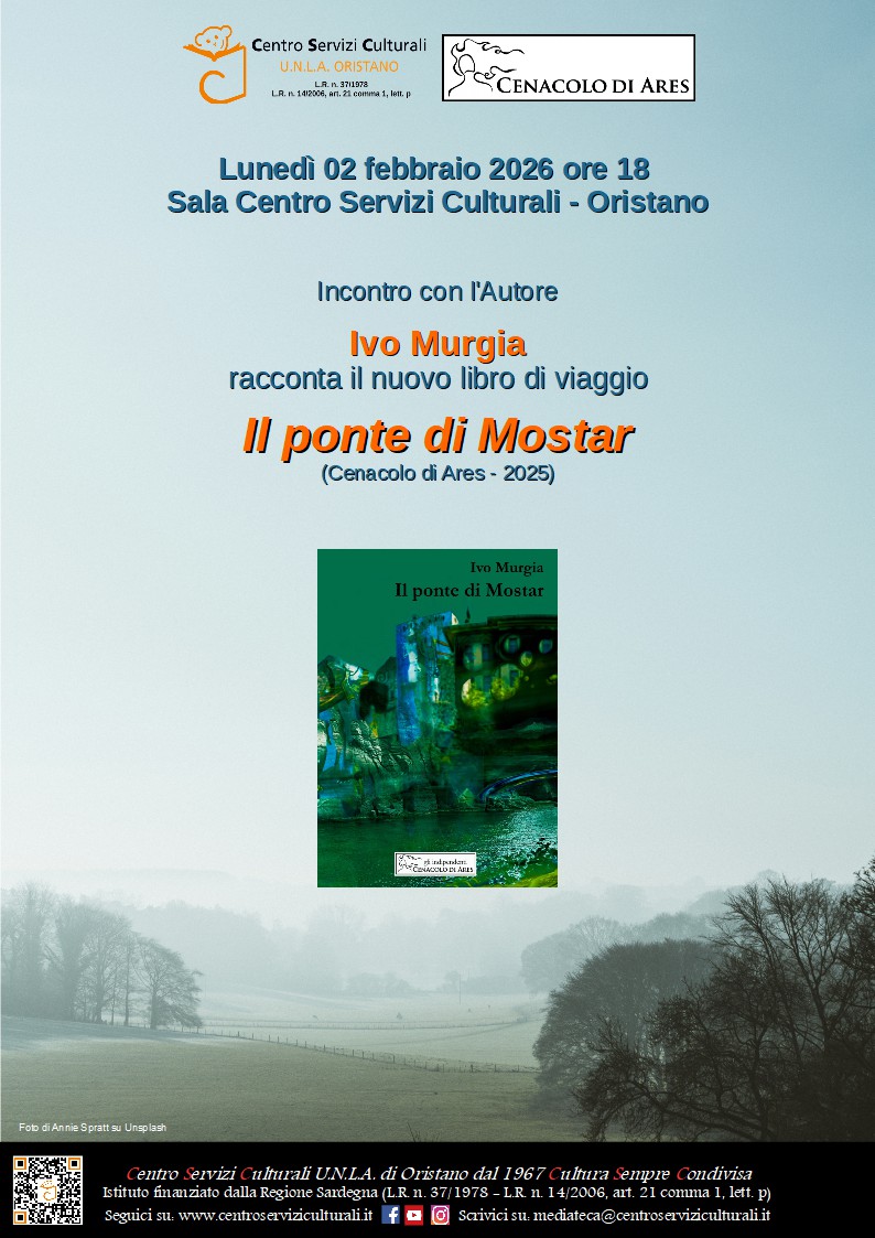Il Centro Servizi Culturali UNLA di Oristano e il Cenacolo di Ares, lunedì 2 febbraio 2026, alle ore 18, nella Sala del Centro Servizi Culturali, organizzano un incontro con Ivo Murgia che racconta il nuovo libro di viaggio “Il ponte di Mostar” (Cenacolo di Ares - 2025).
