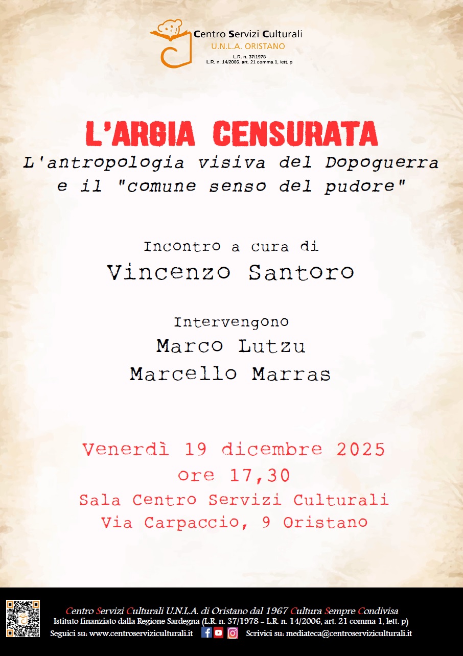 Venerdì 19 dicembre 2025, alle ore 17.30, al Centro Servizi Culturali UNLA, “L'argia censurata. L'antropologia visiva del Dopoguerra e il comune senso del pudore". Incontro a cura di Vincenzo Santoro.