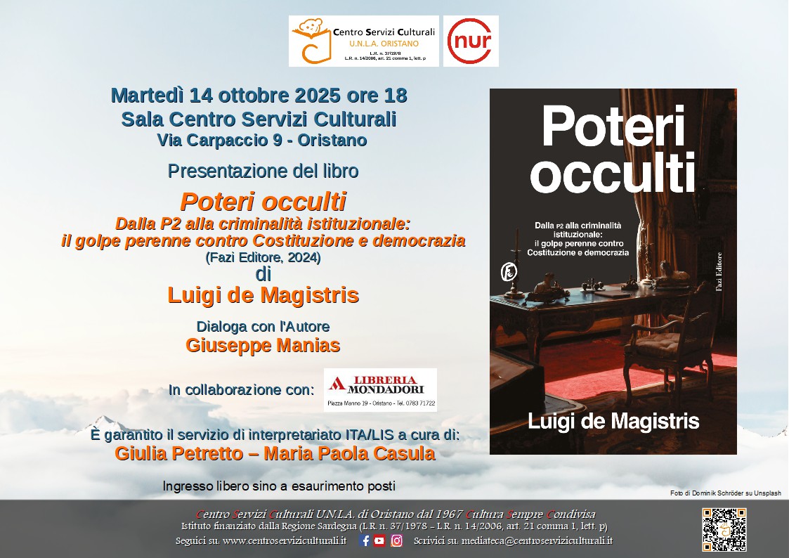 Martedì 14 ottobre 2025, alle ore 18, al Centro Servizi Culturali UNLA, la presentazione del libro “Poteri occulti. Dalla P2 alla criminalità istituzionale: il golpe perenne contro Costituzione e democrazia” (Fazi Editore, 2024) di Luigi de Magistris.