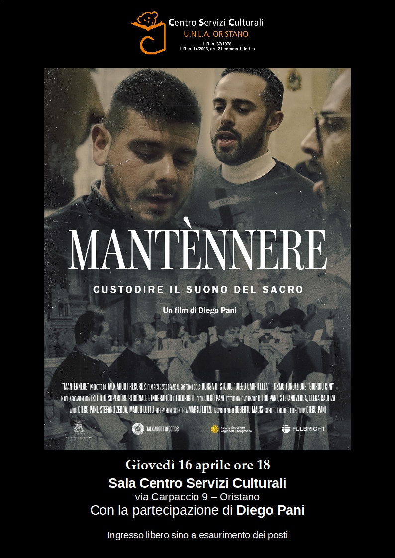Il Film - Il documentario Mantènnere (in sardo “mantenere”, “conservare”) indaga il significato culturale e sociale della tradizione di canto a più voci di Santu Lussurgiu, in Sardegna, concentrandosi su due generazioni di cantori della Confraternita del Rosario. La prima è rappresentata dallo storico Cuncordu ‘e su Rosàriu, che dagli anni ’70 accompagna i rituali della Settimana Santa, la seconda da un gruppo di giovani confratelli che, ricevuto il testimone, sta gradualmente assumendo il ruolo di cantori rituali.