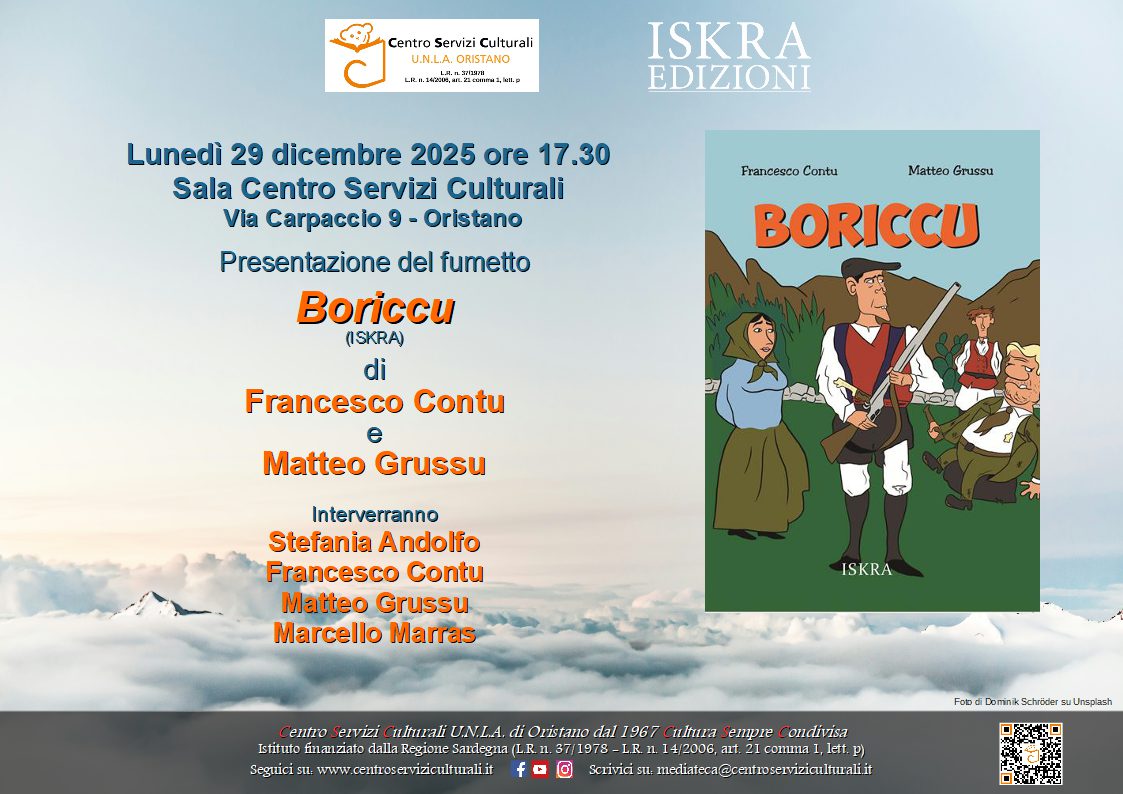 Lunedì 29 dicembre 2025 ore 17.30, al Centro Servizi Culturali UNLA, la presentazione del fumetto “Boriccu” (ISKRA) di Francesco Contu e Matteo Grussu.