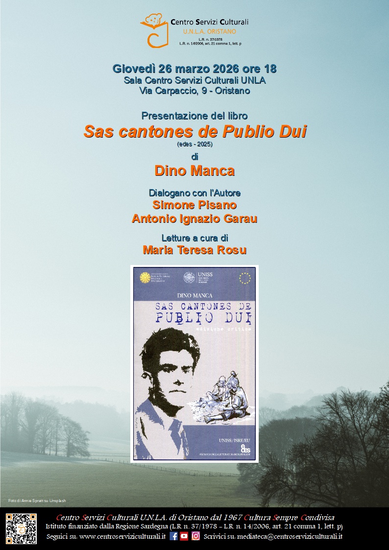 Giovedì 26 marzo 2026, alle 18, al Centro Servizi Culturali, la presentazione del libro “Sas cantones de Publio Dui” (edes - 2025) di Dino Manca, Professore di Filologia della letteratura italiana e Letteratura e filologia della Sardegna all’Università di Sassari.