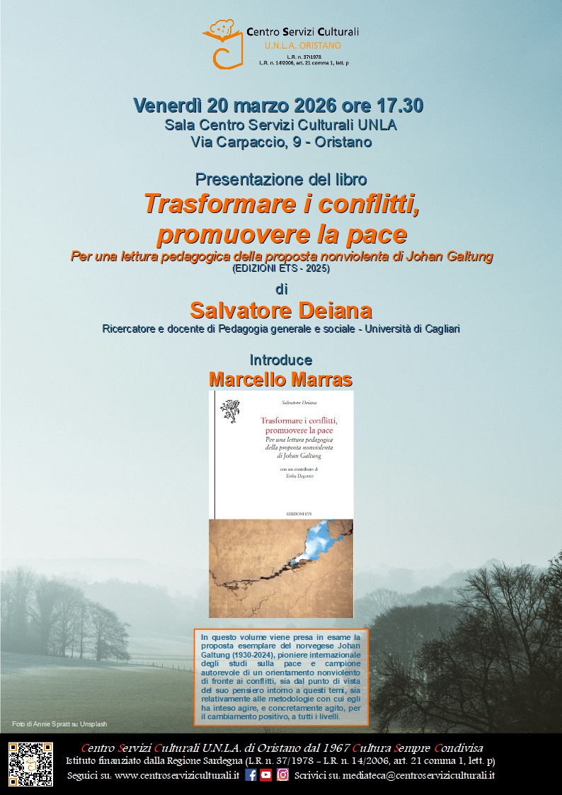 Venerdì 20 marzo 2026, alle 17.30, al Centro Servizi Culturali, la presentazione del libro “Trasformare i conflitti, promuovere la pace. Per una lettura pedagogica della proposta nonviolenta di Johan Galtung” (EDIZIONI ETS - 2025) di Salvatore Deiana, Ricercatore e docente di Pedagogia generale e sociale - Università di Cagliari.