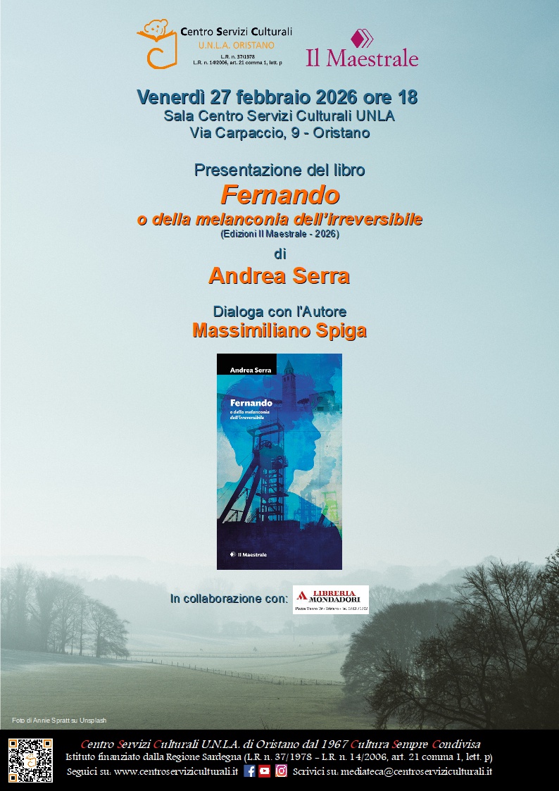 Venerdì 27 febbraio 2026, alle 18, al Centro Servizi Culturali, la presentazione del libro “Fernando o della melanconia dell’irreversibile” (Edizioni Il Maestrale - 2026) di Andrea Serra.