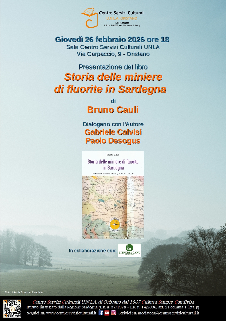 Giovedì 26 febbraio 2026, alle ore 18, al Centro Servizi Culturali, la presentazione del libro “Storia delle miniere di fluorite in Sardegna” di Bruno Cauli.