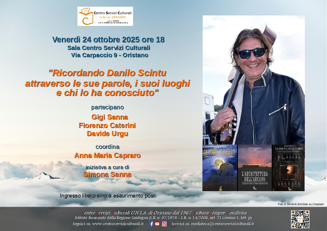Venerdì 24 ottobre 2025, alle ore 18, al Centro Servizi Culturali UNLA, "Ricordando Danilo Scintu attraverso le sue parole, i suoi luoghi e chi lo ha conosciuto". Partecipano Gigi Sanna, Fiorenzo Caterini e Davide Urgu. Coordina Anna Maria Capraro. Iniziativa a cura di Simona Sanna.