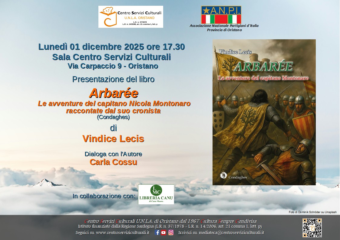 Lunedì 1 dicembre 2025, alle ore 17.30, al Centro Servizi Culturali UNLA, a cura deell’UNLA e dell’ANPI di Oristano, la prima presentazione del romanzo “Arbarée. Le avventure del capitano Nicola Montonaro raccontate dal suo cronista” (Condaghes, 2025) di Vindice Lecis.