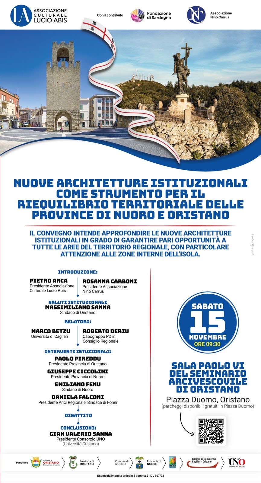 Le Associazioni culturali Senatore Lucio Abis di Oristano e Nino Carrus di Borore, promuovono il convegno dedicato al tema dell’organizzazione del sistema degli Enti locali della Sardegna, in programma sabato 15 novembre, ore 9,30 – Sala Paolo VI – Seminario di Oristano, in piazza Duomo.