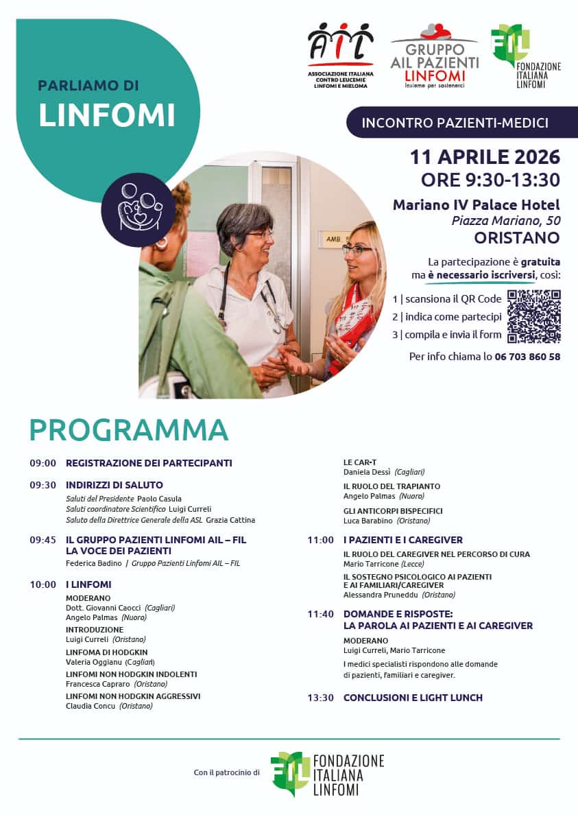La partecipazione è gratuita, ma è necessario iscriversi attraverso il Qr code pubblicato sulla locandina dell’evento o tramite il sito https://pazienti.ail.it/seminari/incontro-pazienti-medici-linfoma-oristano/