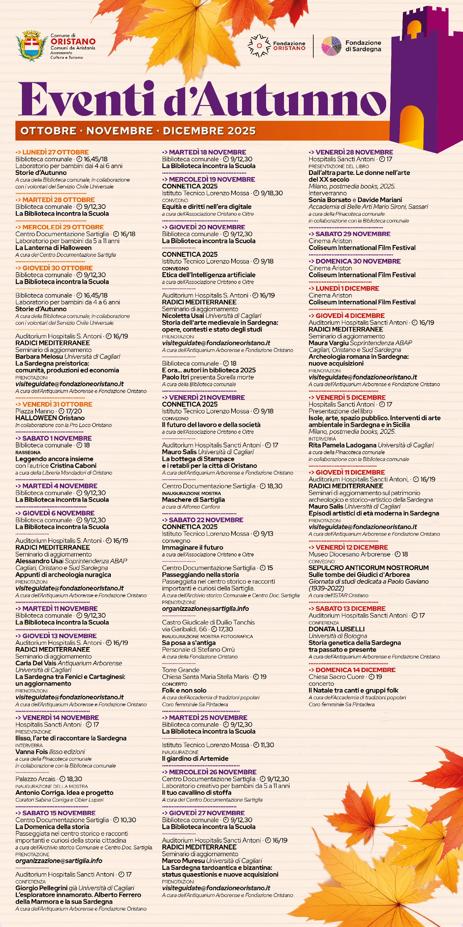 “Il programma è particolarmente ricco – aggiunge l’Assessore alla Cultura Simone Prevete -. Dopo i primi appuntamenti dei giorni scorsi, la rassegna proseguirà nelle prossime settimane offrendo numerosi eventi di qualità fino alla vigilia delle feste di Natale. Un ruolo centrale nella programmazione lo rivestono le manifestazioni organizzate dal Comune e dagli enti collegati, dall’Istar alla Fondazione Oristano, dalla Biblioteca comunale all’Antiquarium arborense e alla Pinacoteca comunale. Tra i tanti appuntamenti vanno segnalati gli omaggi a due uomini di cultura che hanno dato tanto alla città: Antonio Corriga e Paolo Gaviano. Il 14 novembre, a Palazzo Arcais, sarà inaugurata la mostra dedicata al grande pittore a cura di Sabina Corriga e Obler Luperi, mentre il 12 dicembre l’Istar proporrà una giornata di studi dedicata a Paolo Gaviano dal titolo “Sepulcro anticorum nostrorum. Sulle tombe dei Giudici d'Arborea”. Dal 19 al 22 novembre ritorna a Oristano Connetica, la rassegna culturale che per la quarta edizione chiama i giovani di ogni età a costruire un futuro più giusto, sostenibile e umano in giornate di ispirazione, laboratori e connessioni per accendere il cambiamento”.