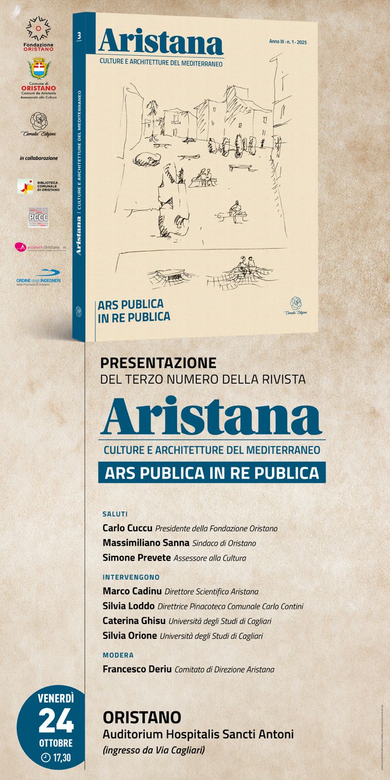 Venerdì 24 ottobre alle 17.30 presso l’Hospitalis Sancti Antoni di Oristano la Fondazione Oristano presenta il terzo numero della rivista “Aristana – Culture e Architetture del Mediterraneo”.